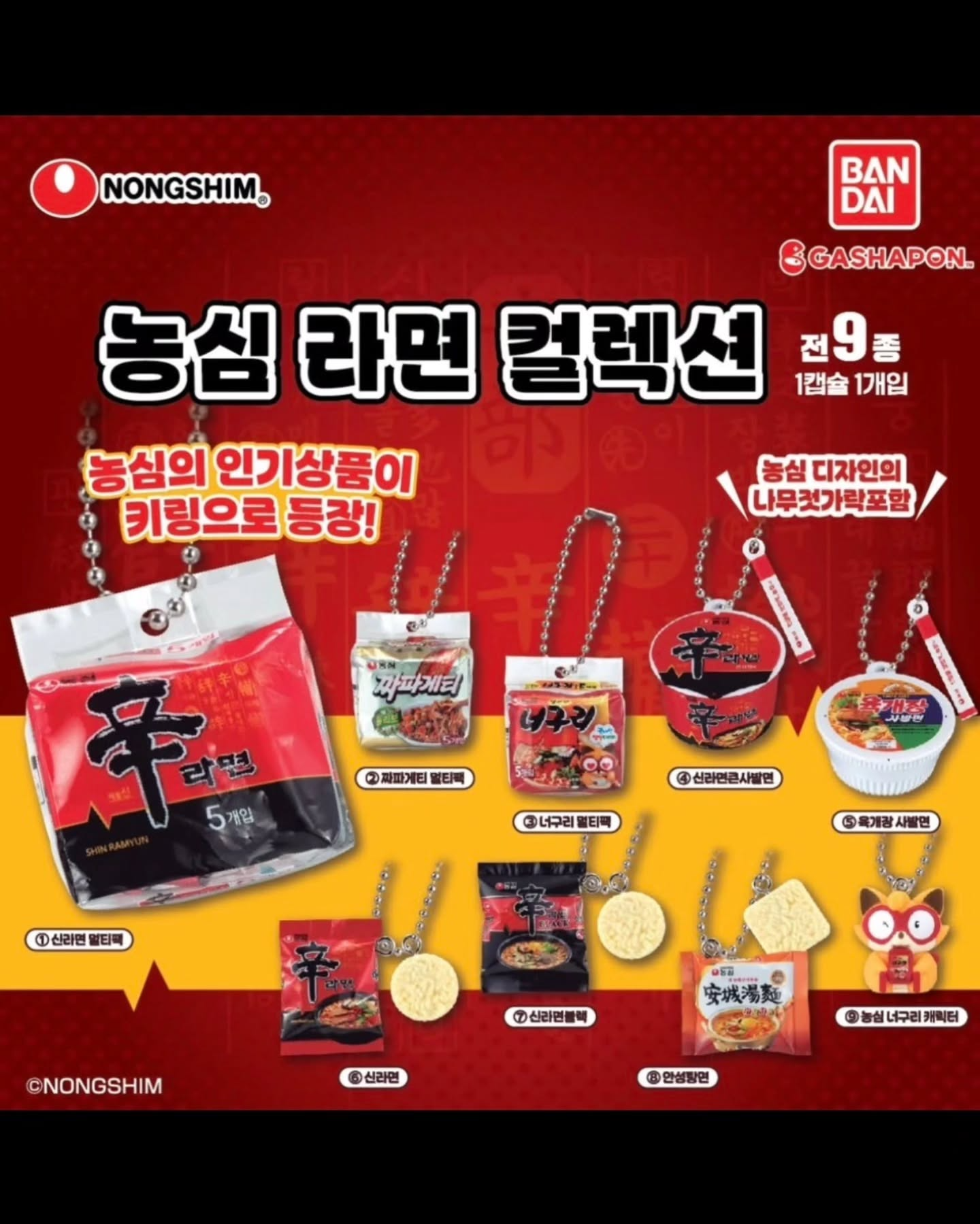 농심이 일본 반다이와 손잡고 인기 라면 브랜드를 활용한 라면 키링 굿즈를 출시했습니다. 이번 협업은 글로벌 캡슐토이 시장을 겨냥해 한글 포장 디자인을 그대로 살린 것이 특징입니다.